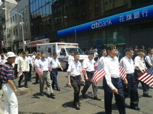 As I look at the determined faces of the veterans marching in front of me on Memorial Day, I am in awe of their quiet dignity. Solemn and sad-eyed, they are the survivors of battles fought, and comrades lost.  Some of them are stoic and steely while others crack jokes, full of mischief. Watching them march on Mott Street, I think of a boy in Chinatown who grew up watching them too. He must have admired their straight lines and precision, the undeniably upright way they held their heads as they stepped smartly down the street. He must have felt intense pride at the sight of these stately servicemen, daydreaming of the moment he could join them.