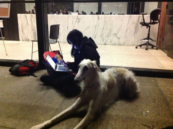 Outside Bobst Library, I make a new friend while the Hurricane Sandy soiree happens inside.